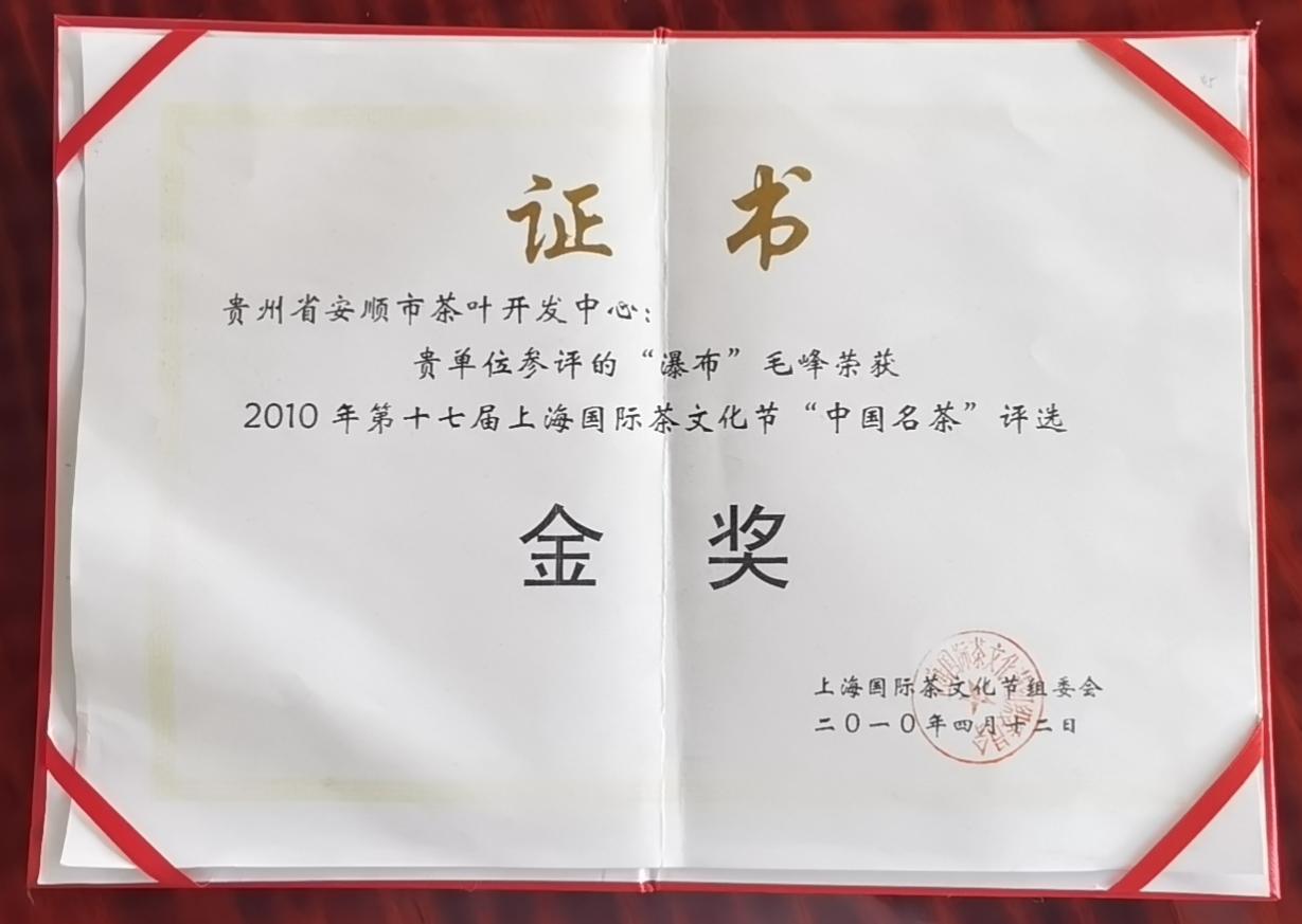 榮譽(yù)資質(zhì) “瀑布”毛峰榮獲2010年第十七屆上海國際茶文化節(jié)“中國名茶”評(píng)選金獎(jiǎng)