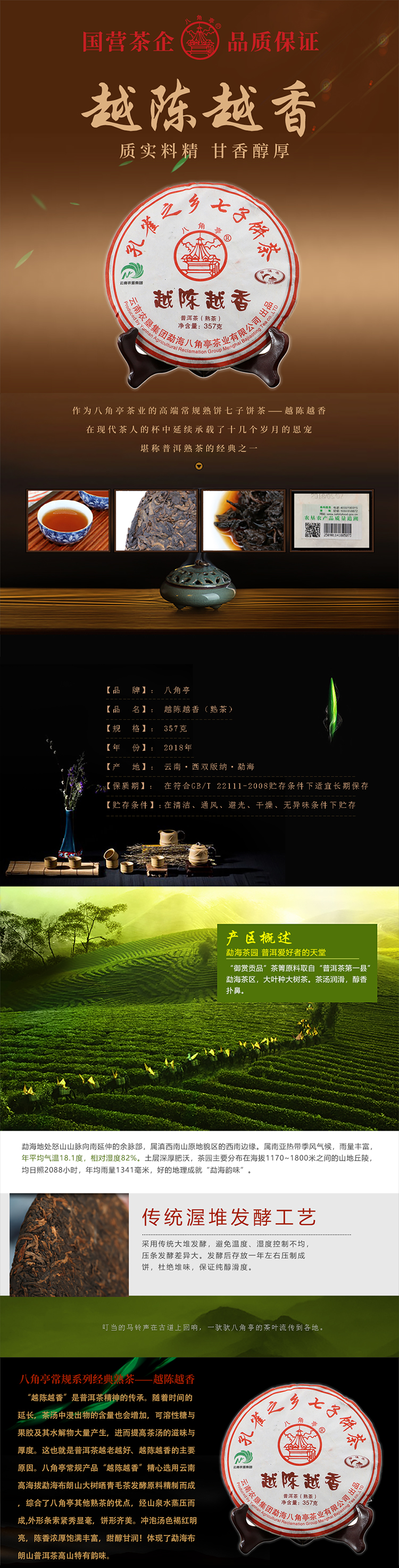 云墾茶業(yè)集團(tuán)下屬茶葉生產(chǎn)企業(yè)——云南農(nóng)墾集團(tuán)勐海八角亭茶業(yè)有限公司原名黎明茶廠,是我國(guó)歷史最為悠久的茶企之一,曾位列“中國(guó)普洱茶十大知名品牌”“十大最受歡迎茶葉品牌”、“中國(guó)普洱茶十大暢銷品牌”中,成為今天市場(chǎng)上最有影響力的品牌之一。公司產(chǎn)品獲得“綠色食品”、ISO9001、 HACCP和云茶品牌(YC)4項(xiàng)認(rèn)證,連續(xù)獲得“云南名牌農(nóng)產(chǎn)品”“云南名牌產(chǎn)品”“云南省著名商標(biāo)”等品牌榮譽(yù),公司生產(chǎn)的多款普洱茶在歷次專業(yè)評(píng)比中多次獲得特等金獎(jiǎng)和金獎(jiǎng)。在2018第五屆中國(guó)企業(yè)五星品牌論壇上,云南農(nóng)墾集團(tuán)勐海八角亭茶業(yè)有限公司上榜中國(guó)普洱茶行業(yè)影響力品牌——“金芽獎(jiǎng)”,公司負(fù)責(zé)人陳勝軍先生獲“陸羽獎(jiǎng)”,被授予2017“國(guó)際十大杰出茶人”榮譽(yù)稱號(hào)。